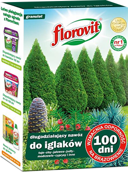 Aby zapewnić naszym iglakom optymalne warunki do wzrostu i rozwoju powinniśmy dostarczyć im wszelkich niezbędnych składników pokarmowych i mikroelementów. Nawożenie rozpoczynamy wiosną (marzec), gdy ruszy wegetacja. W przypadku iglaków sprawdzają się zarówno nawozy granulowane, jak i płynne doglebowe, np. Florovit nawóz do roślin iglastych. Zapewniają one roślinom intensywny wzrost i wybarwienie, a także gęstość i odporność na choroby. Jeśli nie mamy zbyt dużo czasu na pielęgnację naszych iglaków – można zastosować Florovit długodziałający nawóz do iglaków 100 dni. Dzięki powolnemu uwalnianiu składników pokarmowych gwarantuje on optymalne odżywienie roślin dzień po dniu przez okres 100 dni.